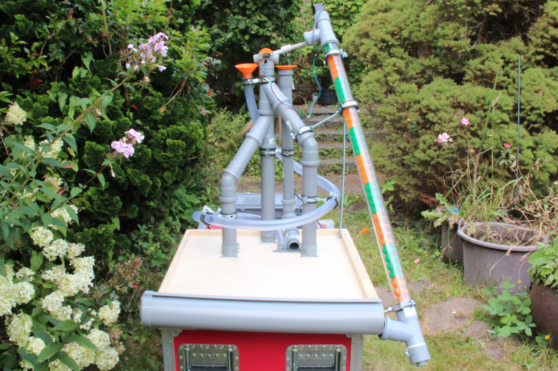 Man kann das Ganze auch sehr viel einfacher und ohne Technik gestalten. Eine Holzstange auf einem Brett, einen Gartenschlauch drum rumgewickelt und einen Eimer am Ende der Holzplatte. Fertig. Der „aufwendige“ Transport der Murmeln von unten nach oben wird dann von fleißigen Kinderhänden übernommen. Das ist sehr viel einfacher und macht genau so viel Spaß. Also… ran an die Murmeln…